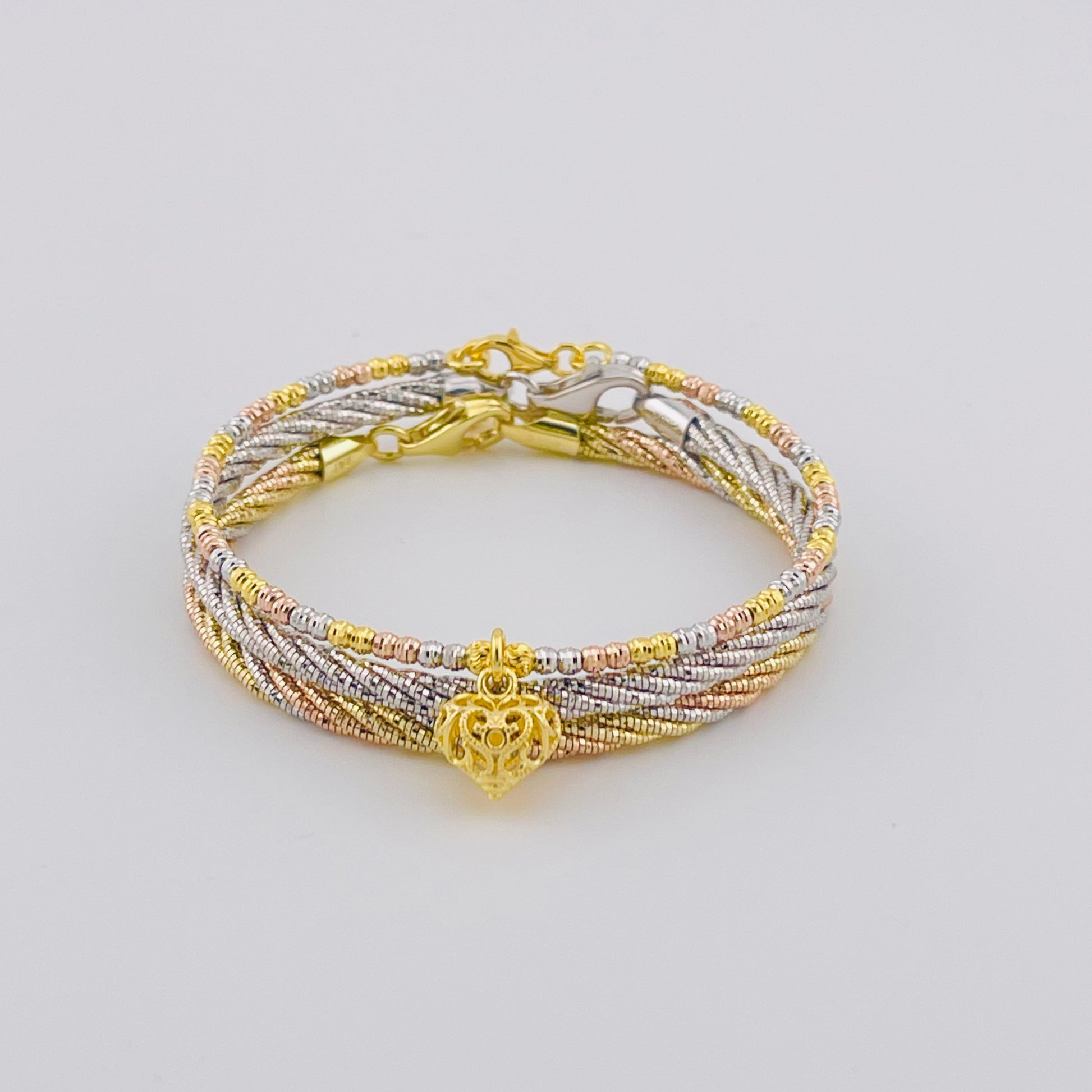 Made in Italy, 3-Piece Tri-Color Gold Plated 925 Silver Multi-Strand Bracelet with Filigree Heart Charm Infused with elegance and symbolic meaning, this bracelet set blends beauty and intention. Featuring multiple strands of shimmering yellow, white and rose gold-plated 925 sterling silver, it creates a luxurious yet versatile statement. At the center, a delicately designed gold-plated heart charm represents love, compassion, and emotional connection.