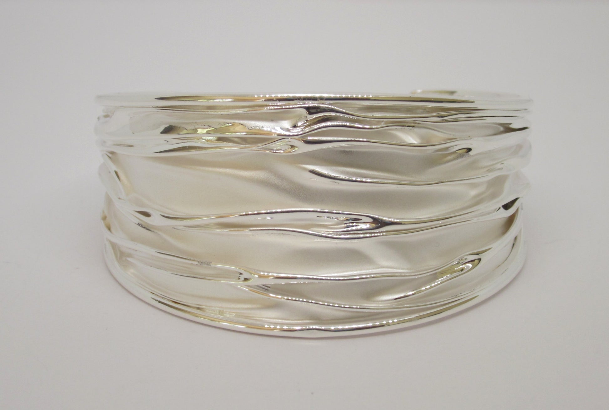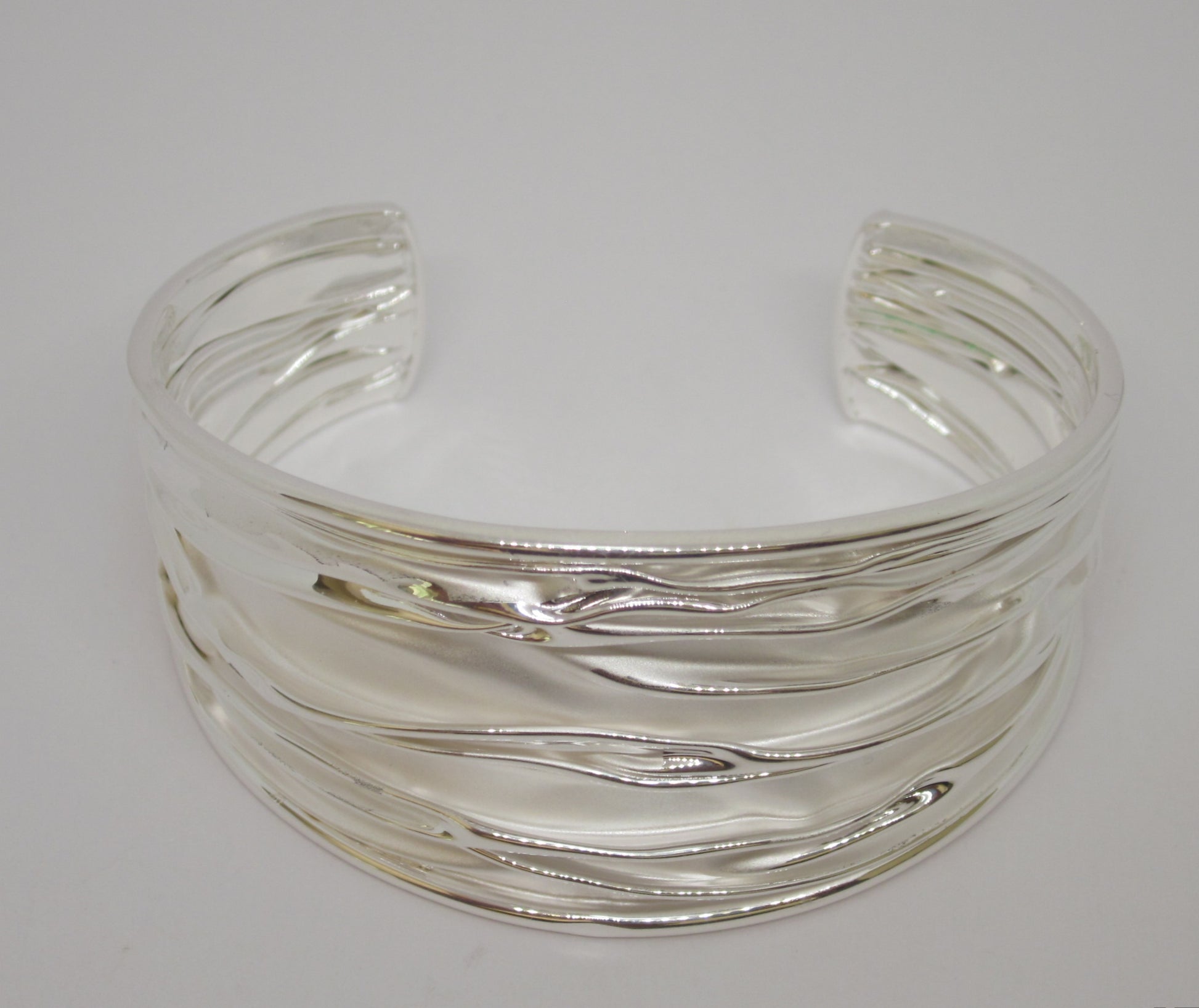 Designed with a fluid wave motif, this wide cuff captures light beautifully, creating a sophisticated shimmer that complements any style—from minimalist to contemporary.