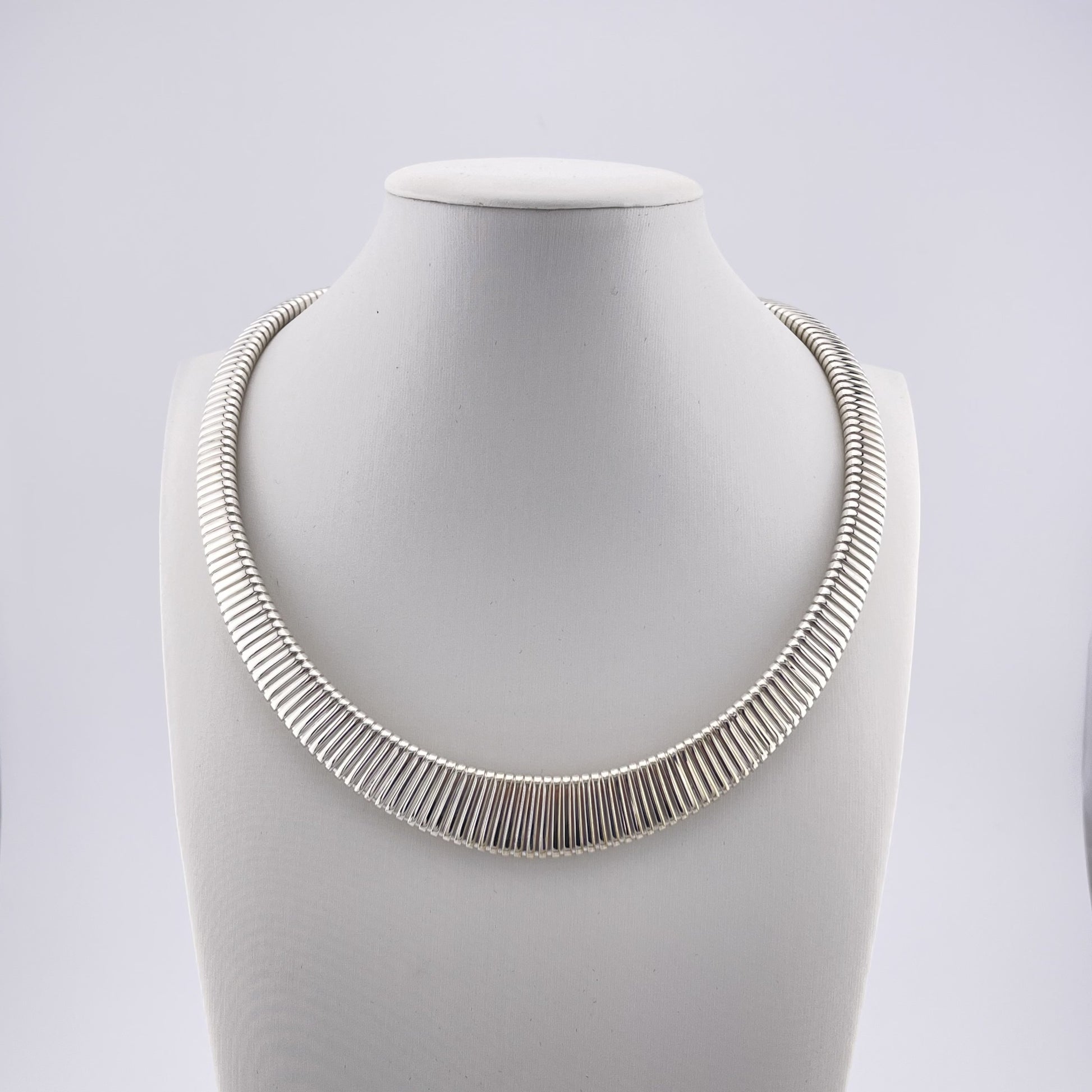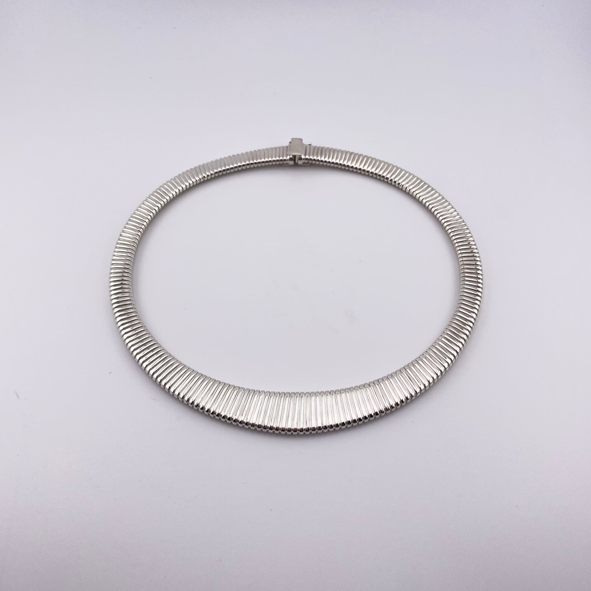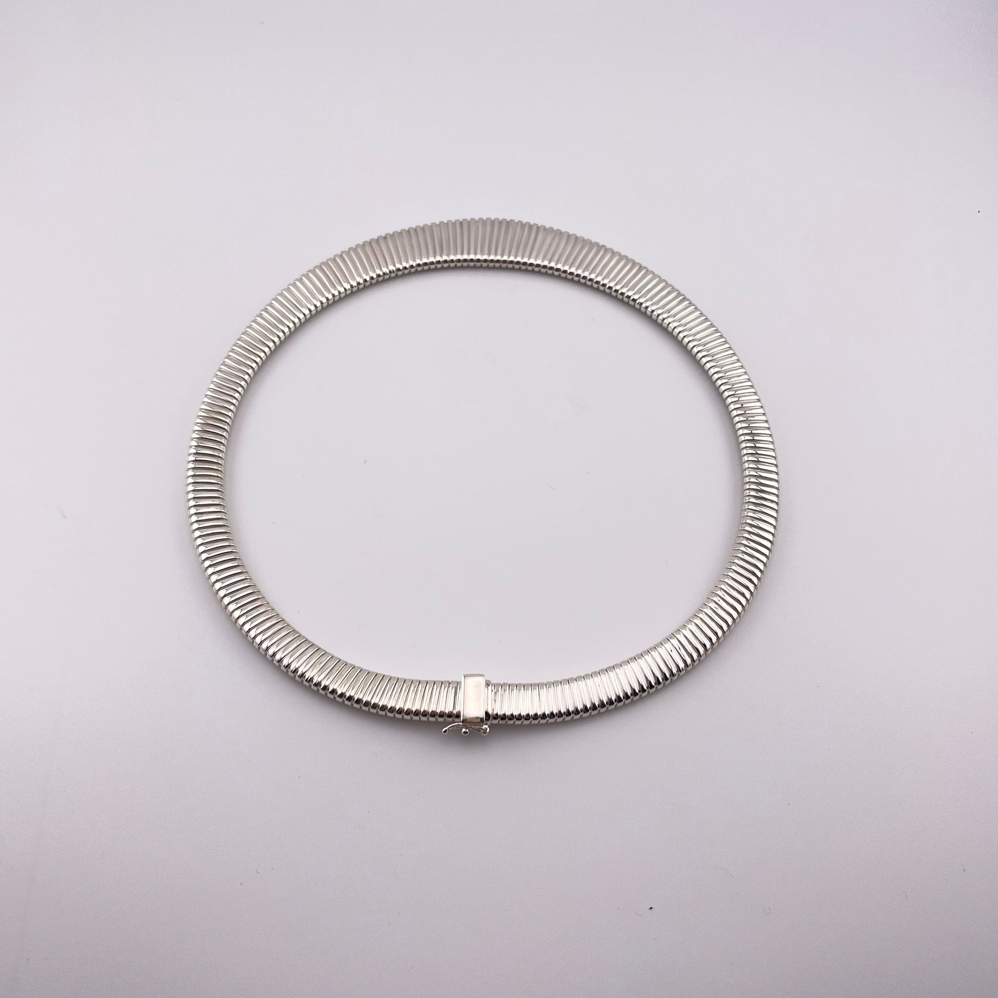 Make a timeless statement with this authentic Italian sterling silver necklace, exquisitely handcrafted in Italy with superior artistry. The ribbed collar design creates a bold yet elegant silhouette, offering a luxurious shine and a fluid, comfortable fit. Whether worn as a choker necklace or a collar necklace, this piece is versatile, modern, and effortlessly chic.