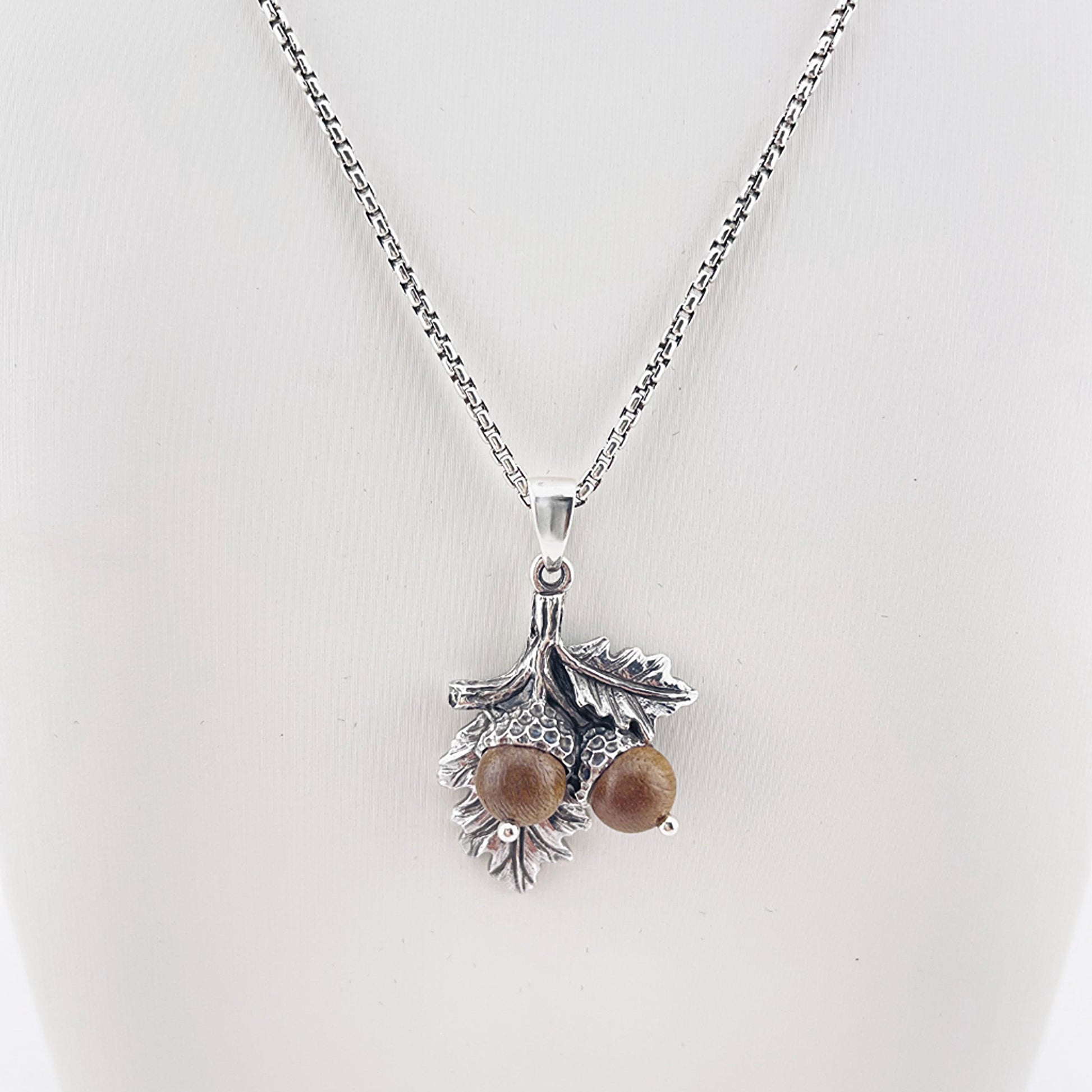 Inspired by the beauty of the oak tree, this handcrafted necklace features a detailed 925 sterling silver pendant with two natural sandalwood acorns nestled among textured silver oak leaves. The acorn, a timeless symbol of strength, growth, and prosperity, pairs beautifully with the warm, earthy tones of sandalwood, creating a piece that is both elegant and meaningful.