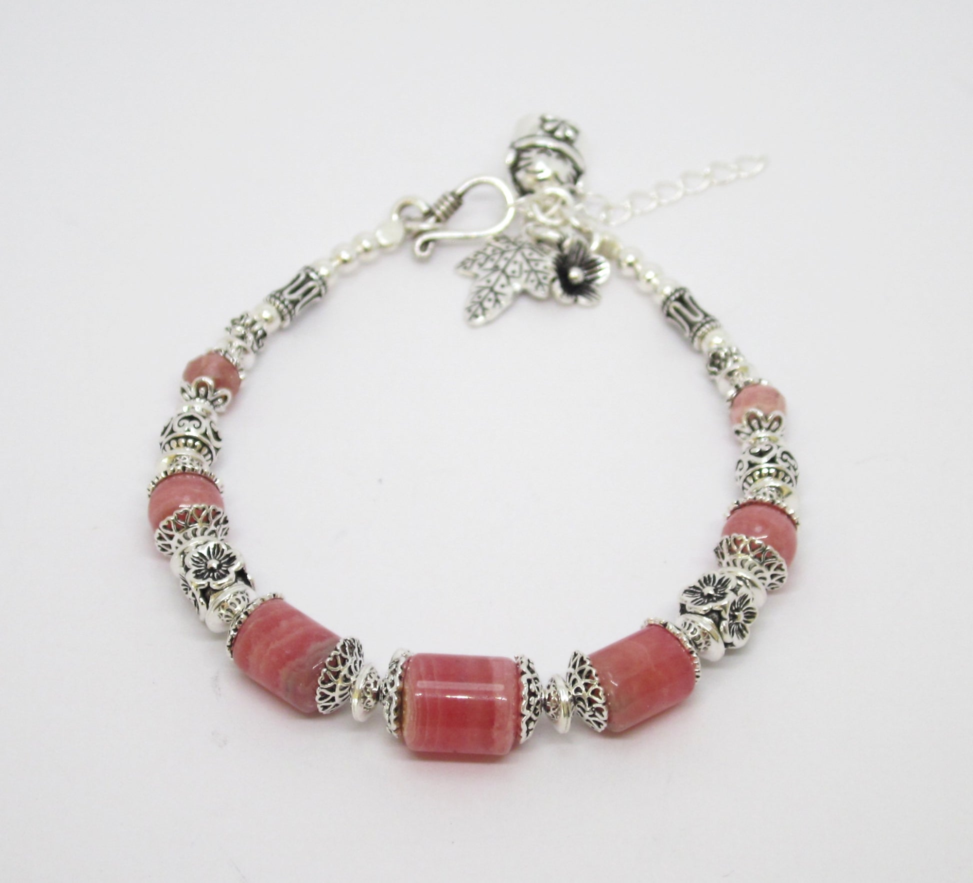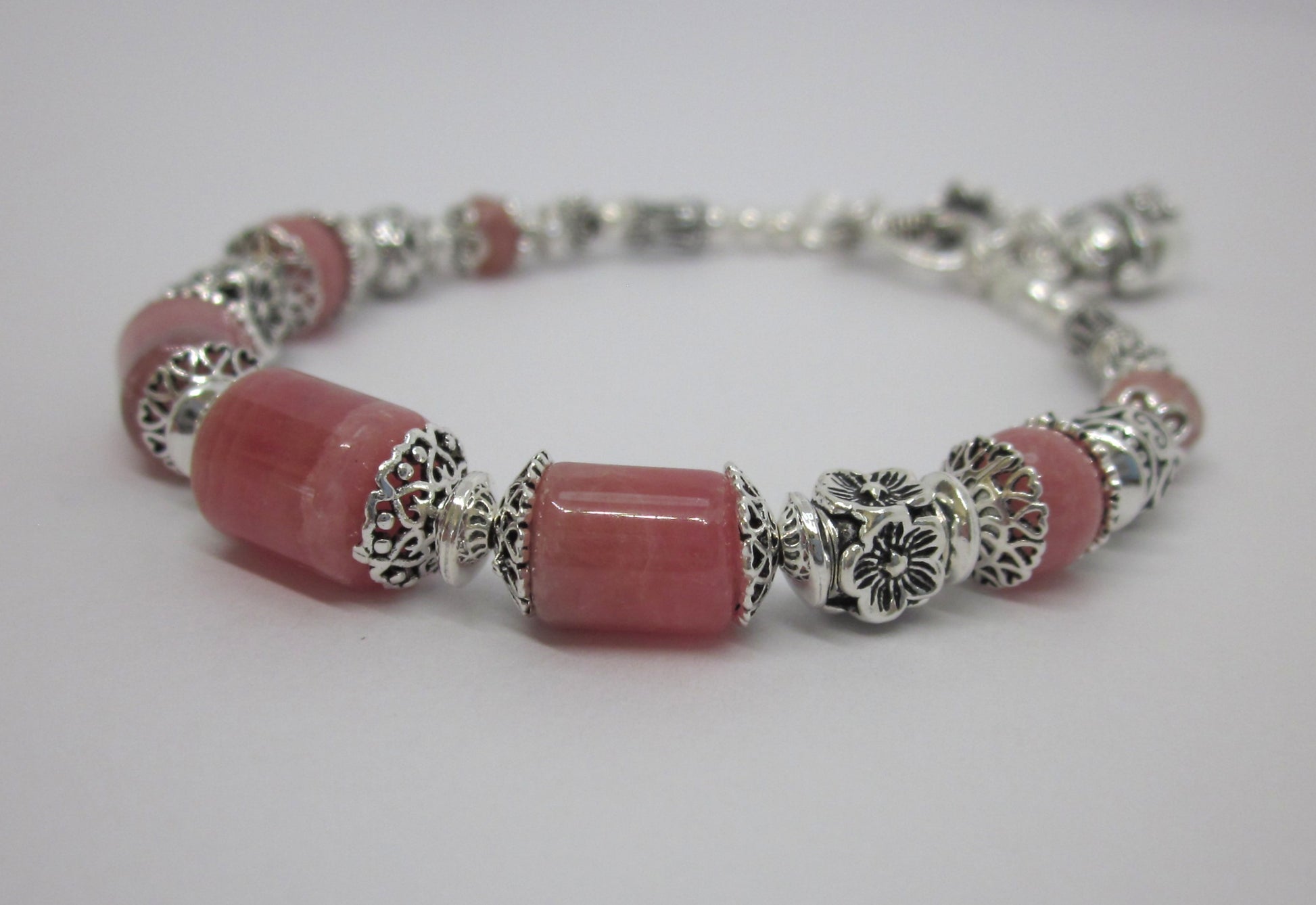 Discover the exquisite beauty of this handcrafted bracelet featuring genuine Rhodochrosite semi-precious gemstones in their natural pink hues. Each bracelet showcases carefully selected cylindrical and round Rhodochrosite beads, complemented by intricately detailed S925 sterling silver accents. The ornate silver beads feature stunning heart motifs, floral patterns, and delicate filigree work that adds a sophisticated vintage charm. This substantial piece offers both elegance and durability with its quality construction and premium materials. The adjustable length ensures a perfect fit for any wrist size, while the decorative toggle clasp adds both security and style. The harmonious combination of soft pink stones and gleaming silver makes this bracelet a versatile accessory that pairs beautifully with both casual and formal attire. Each piece exhibits slight variations in stone patterns, making your bracelet truly one-of-a-kind. This stunning bracelet arrives ready for gift-giving, perfect for treating yourself or someone special to a piece of handcrafted jewelry that combines timeless design with natural beauty.
