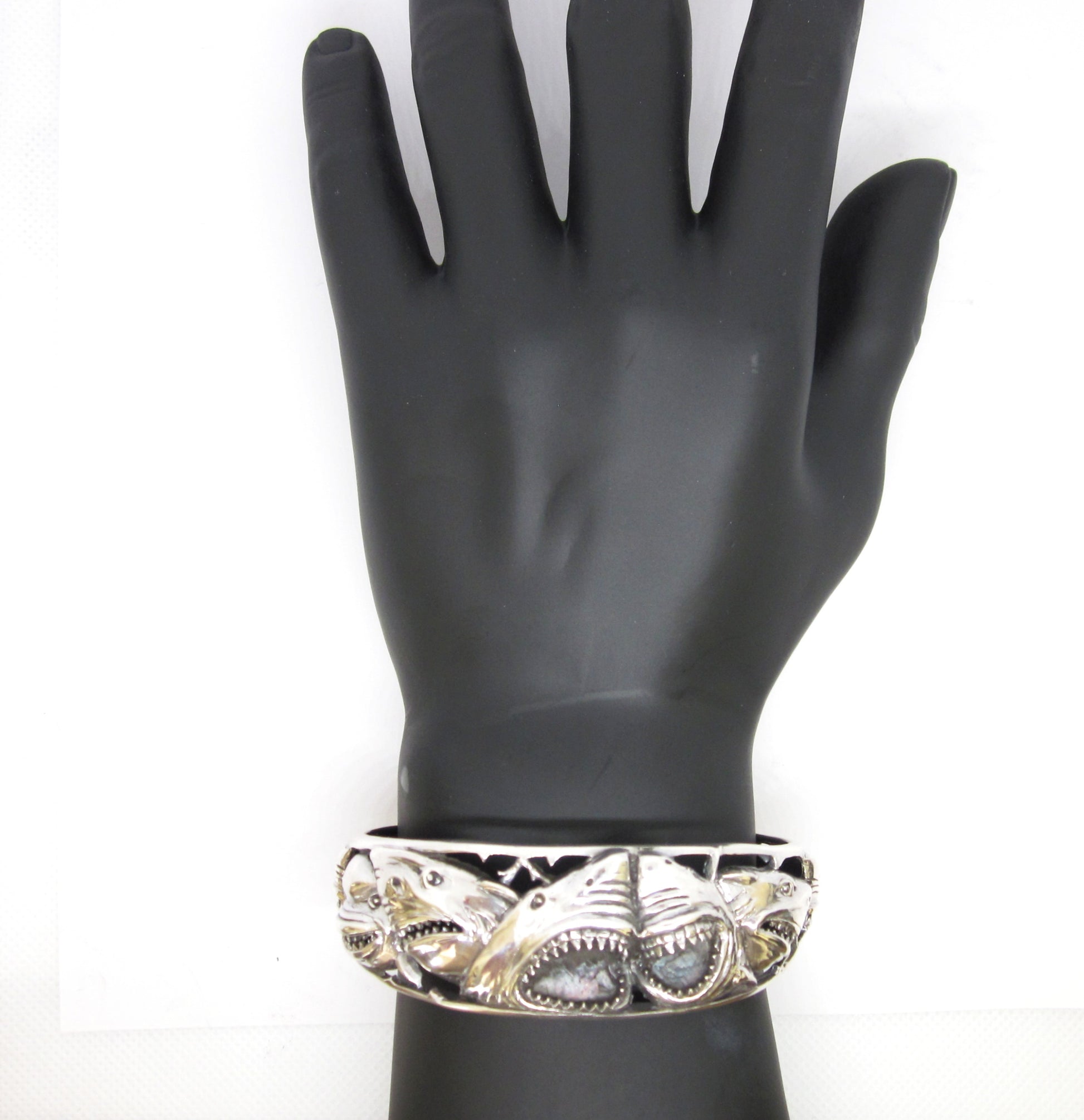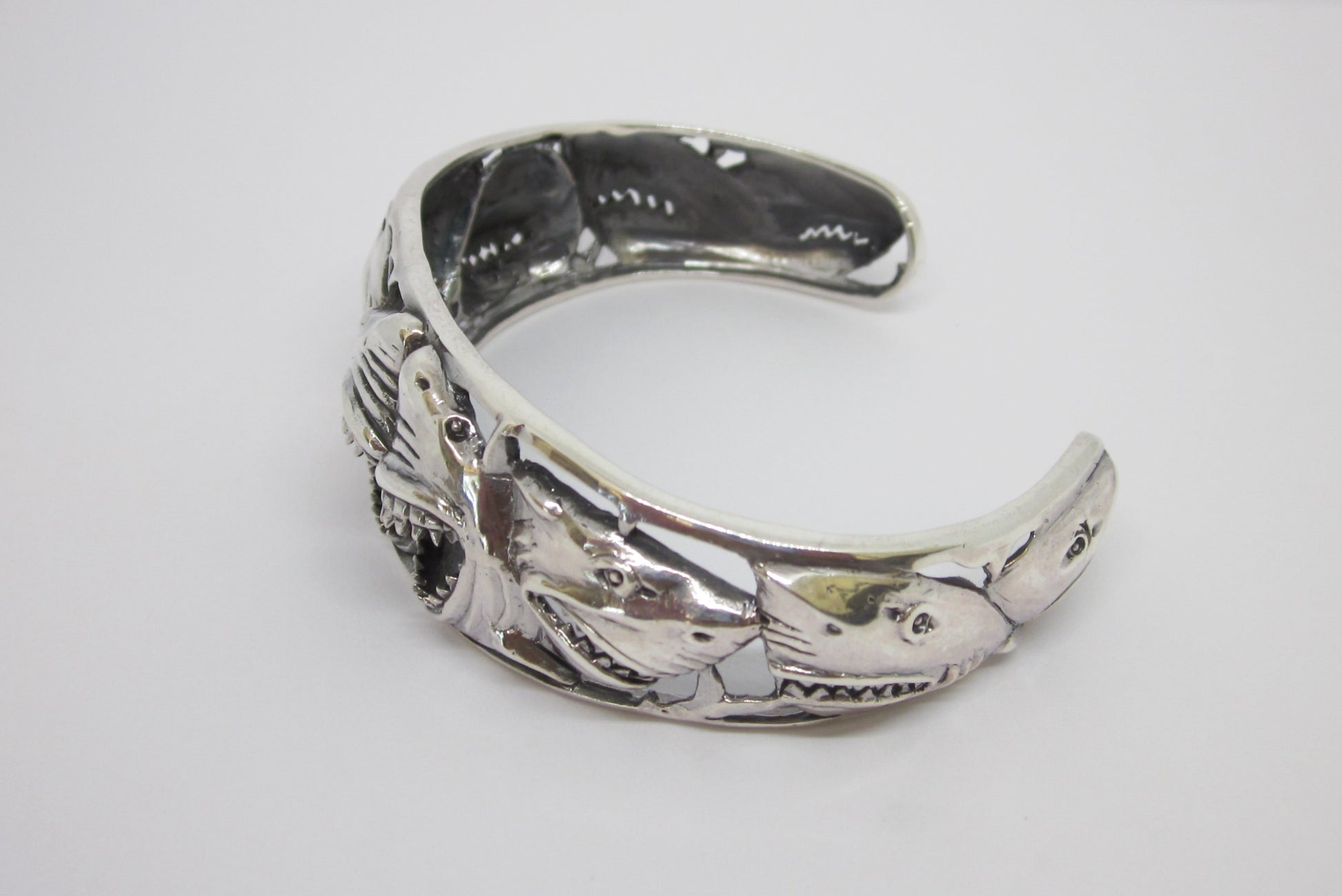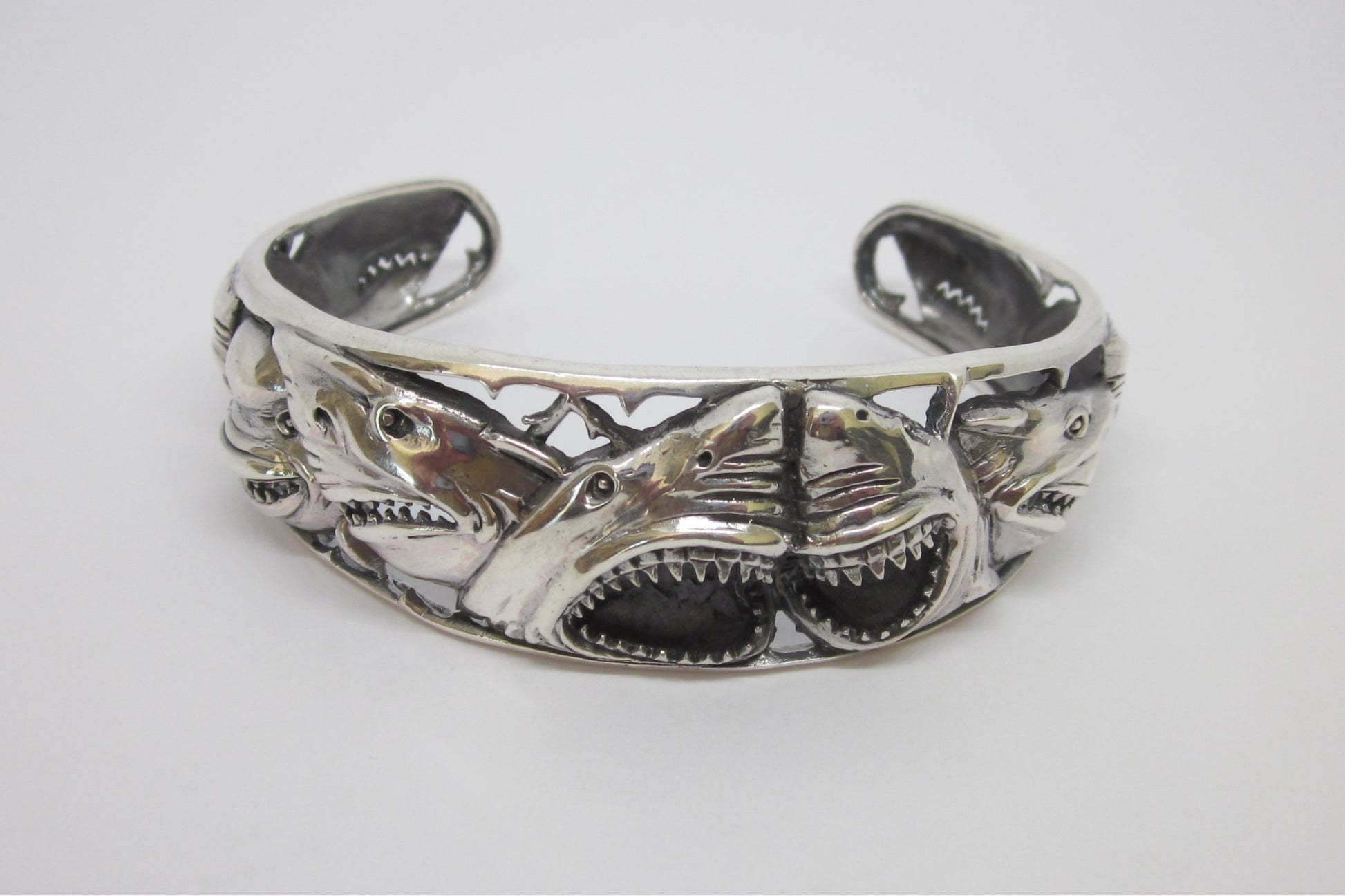 Each shark is designed with fierce expressions, razor-sharp teeth, and lifelike gills, creating a dramatic and eye-catching accessory. The cutout background and oxidized finish highlight the handcrafted artistry, while the open cuff allows for easy adjustment to fit most wrist sizes.