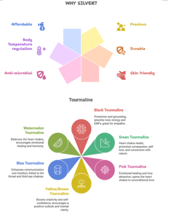 •   Natural Tourmaline beads in a rainbow of earthy hues (green, pink, golden, blue) representing balance, love, and grounding.