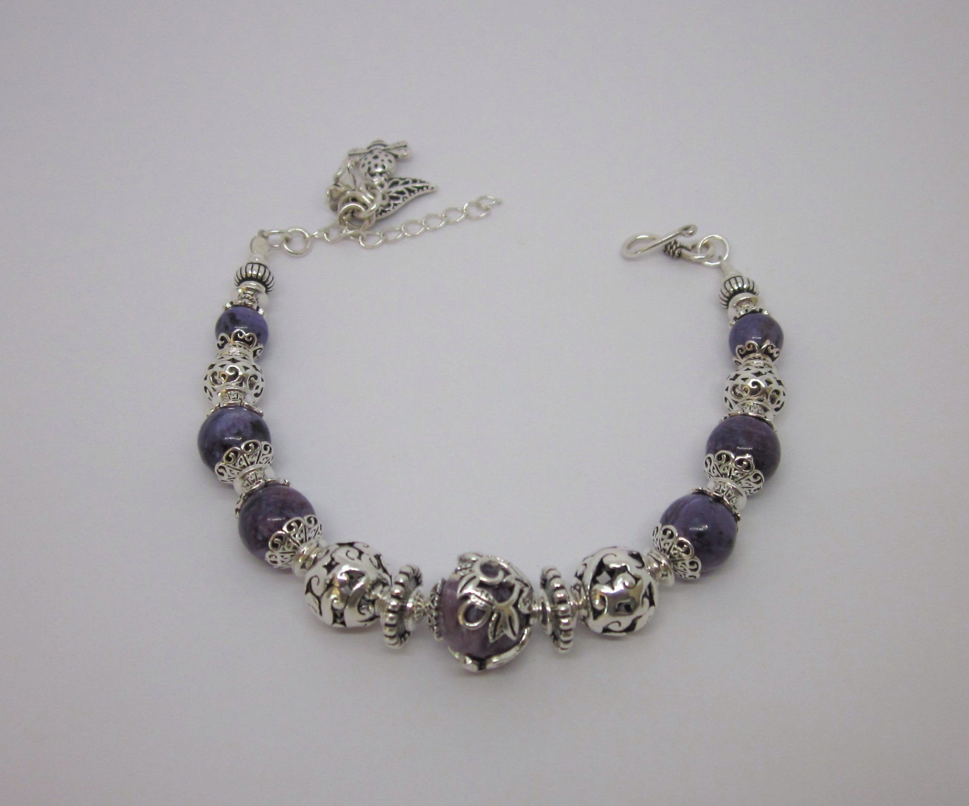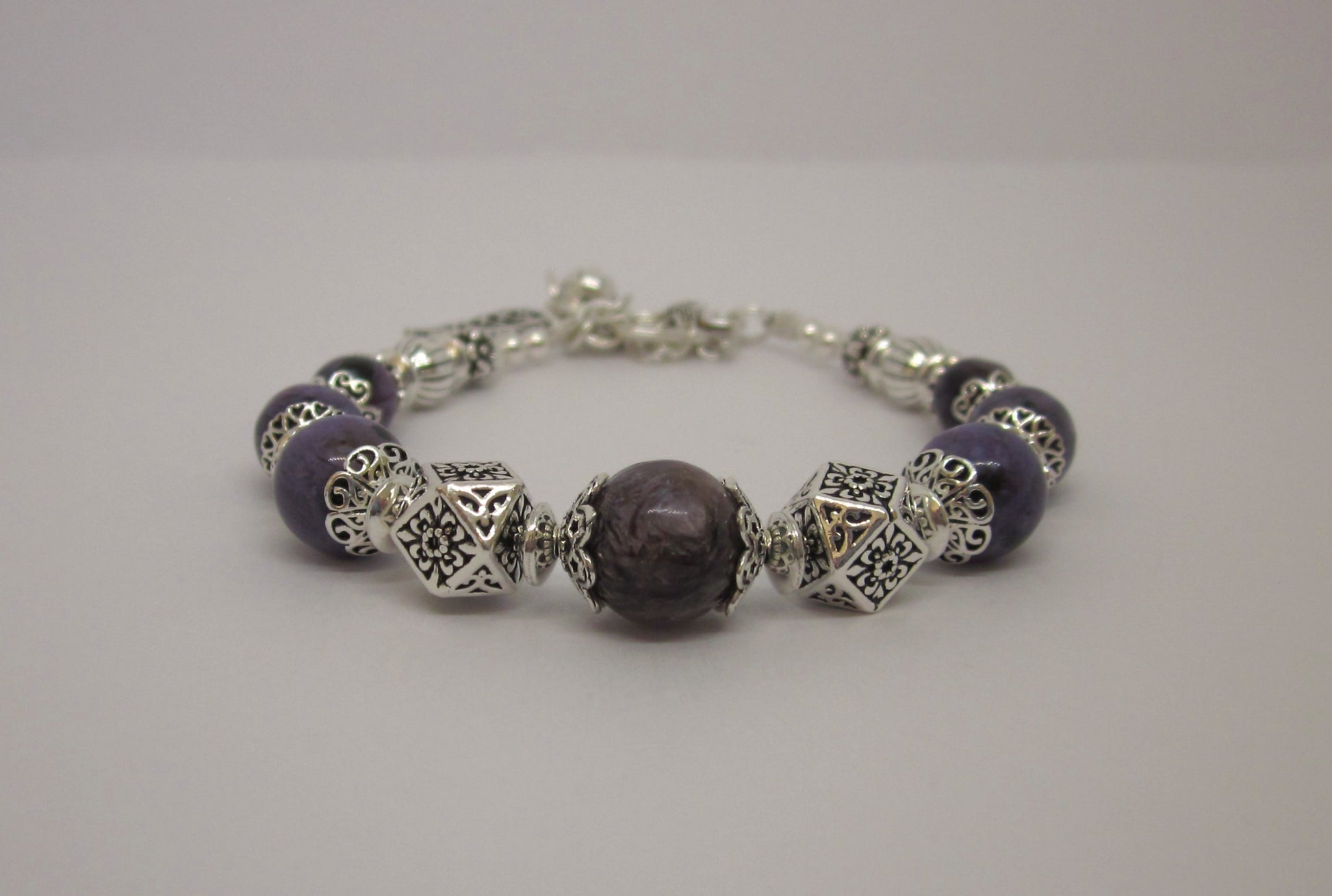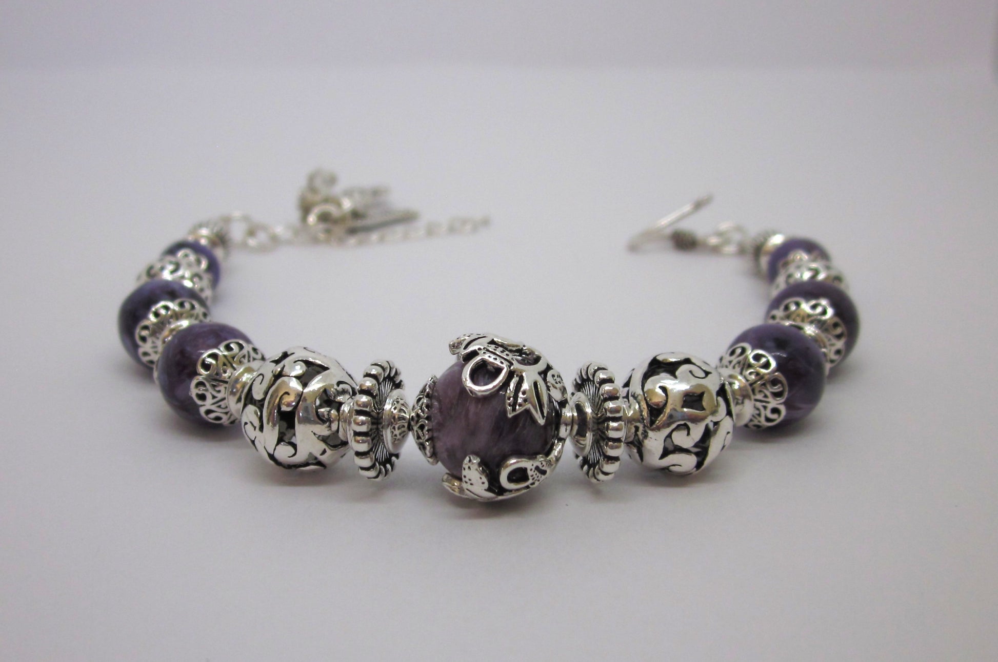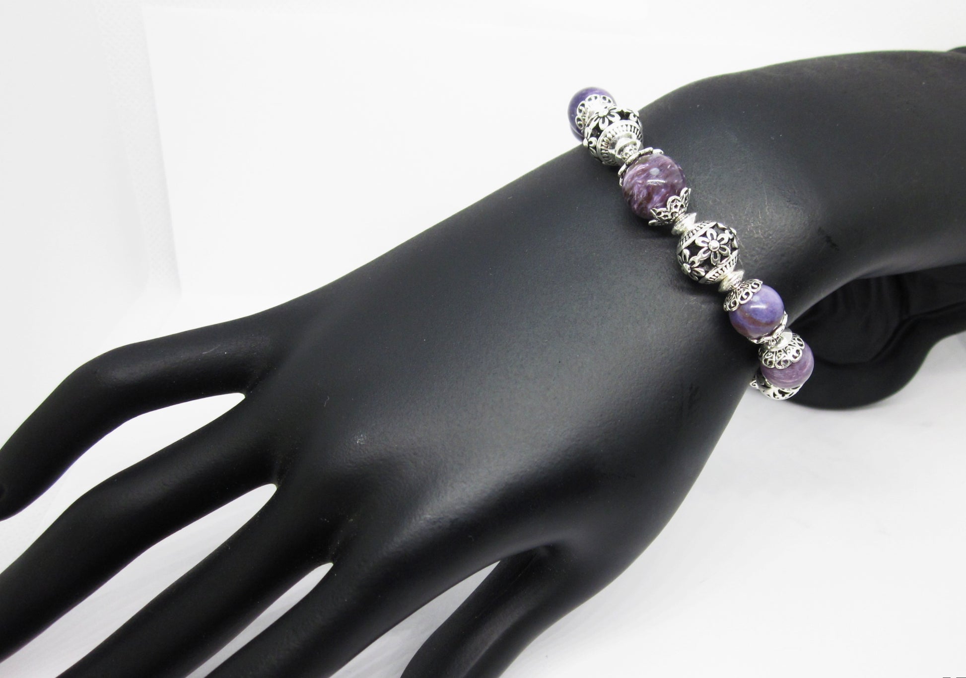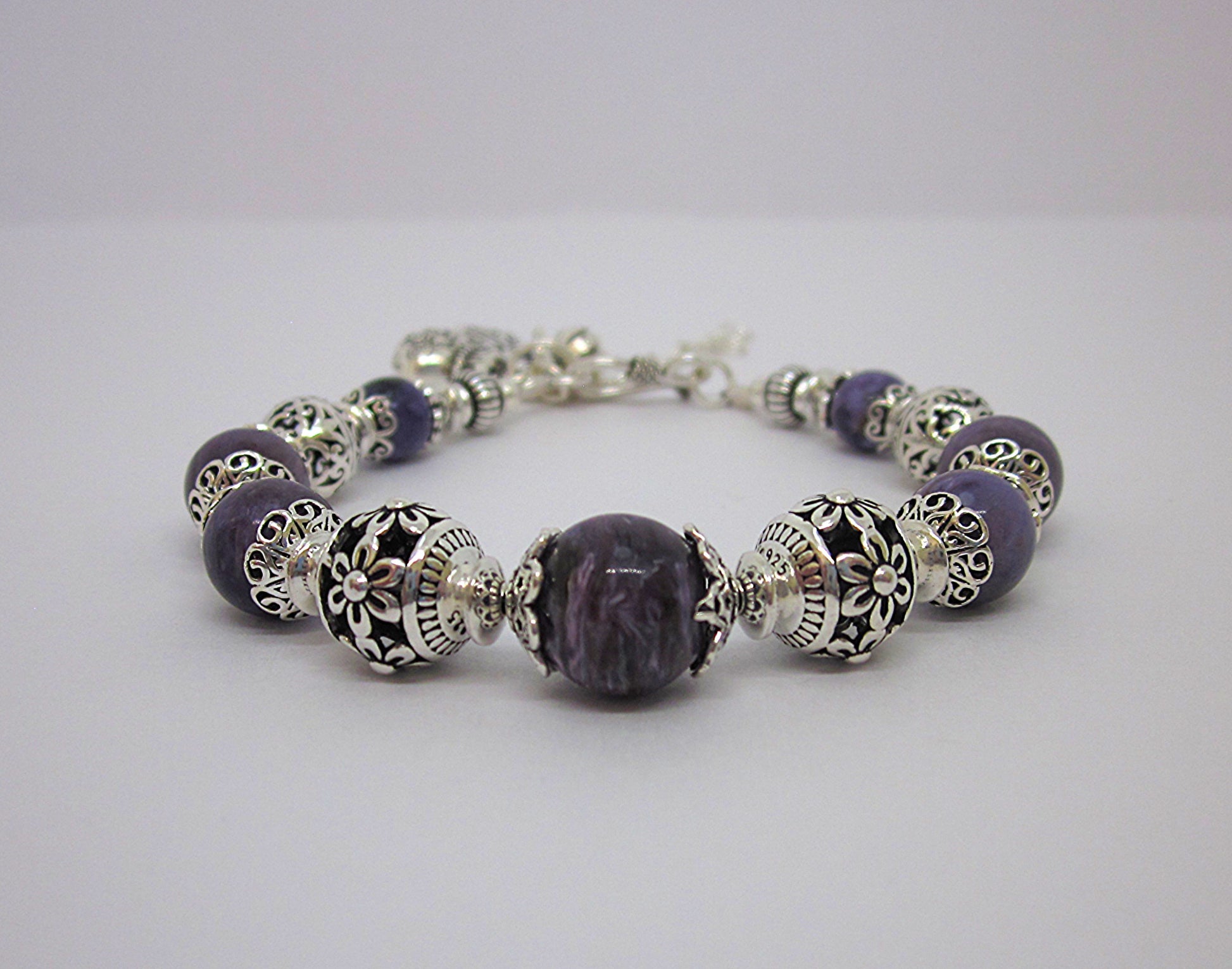Step into a world of spiritual elegance with this handmade Charoite bracelet, featuring richly colored purple stones and intricate 925 sterling silver detailing. Each bracelet is uniquely crafted, offering subtle variations in color and bead arrangement, making every piece truly one of a kind.
