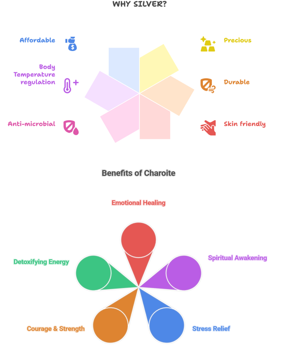 • Natural Charoite beads, known for their mesmerizing swirls of violet, lavender, and black.