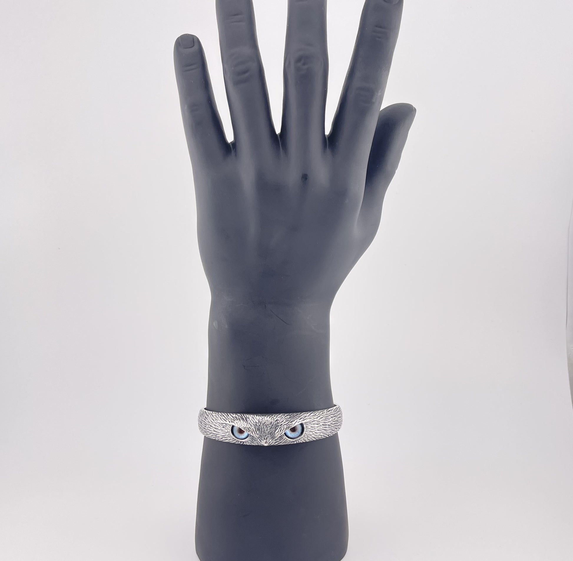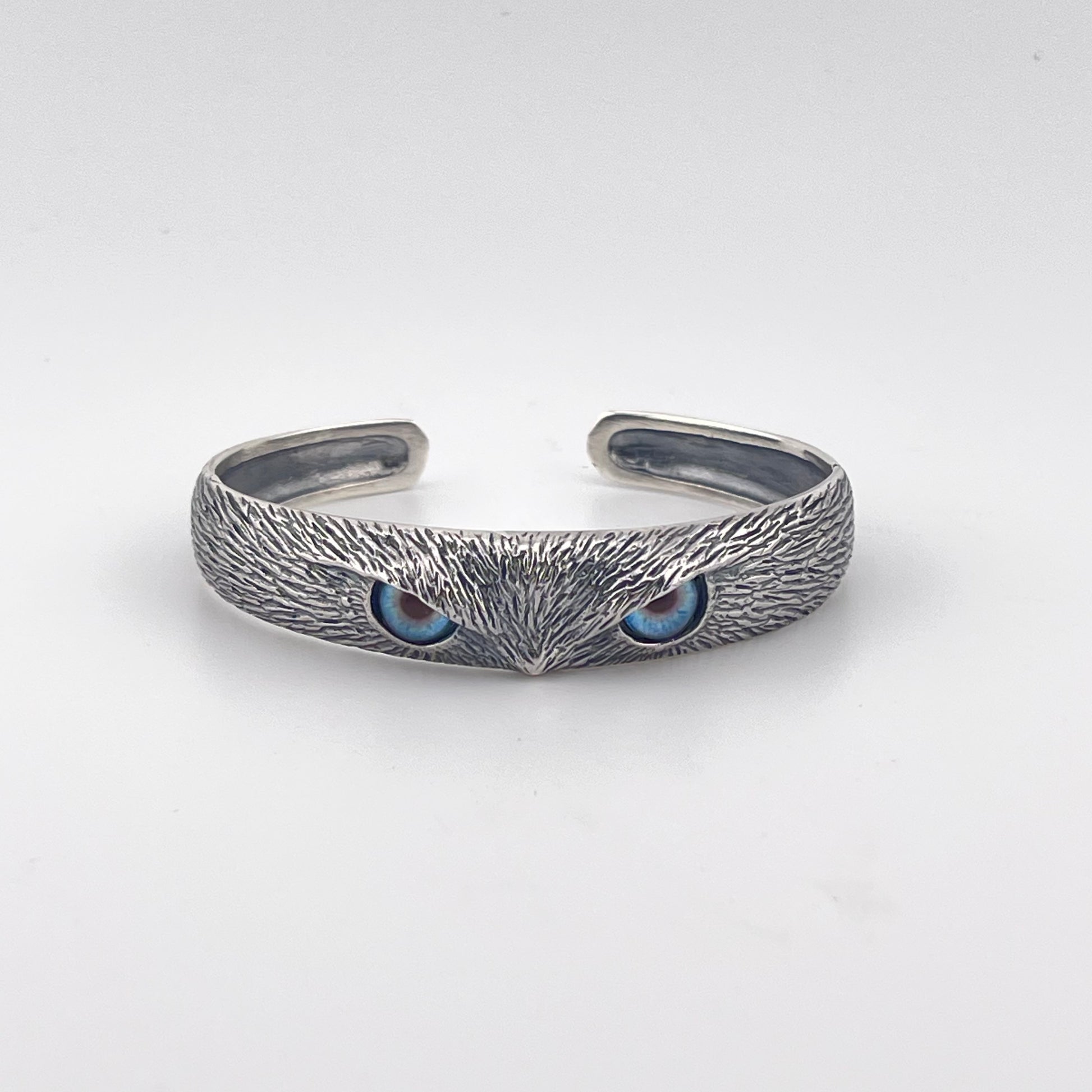 Bring wisdom and mystery to your style with this handmade 925 sterling silver cuff bracelet featuring a bold owl design with piercing blue eyes. Crafted with intricate feather details and oxidized silver texture, this unique bracelet is a true statement piece of artisan jewelry.