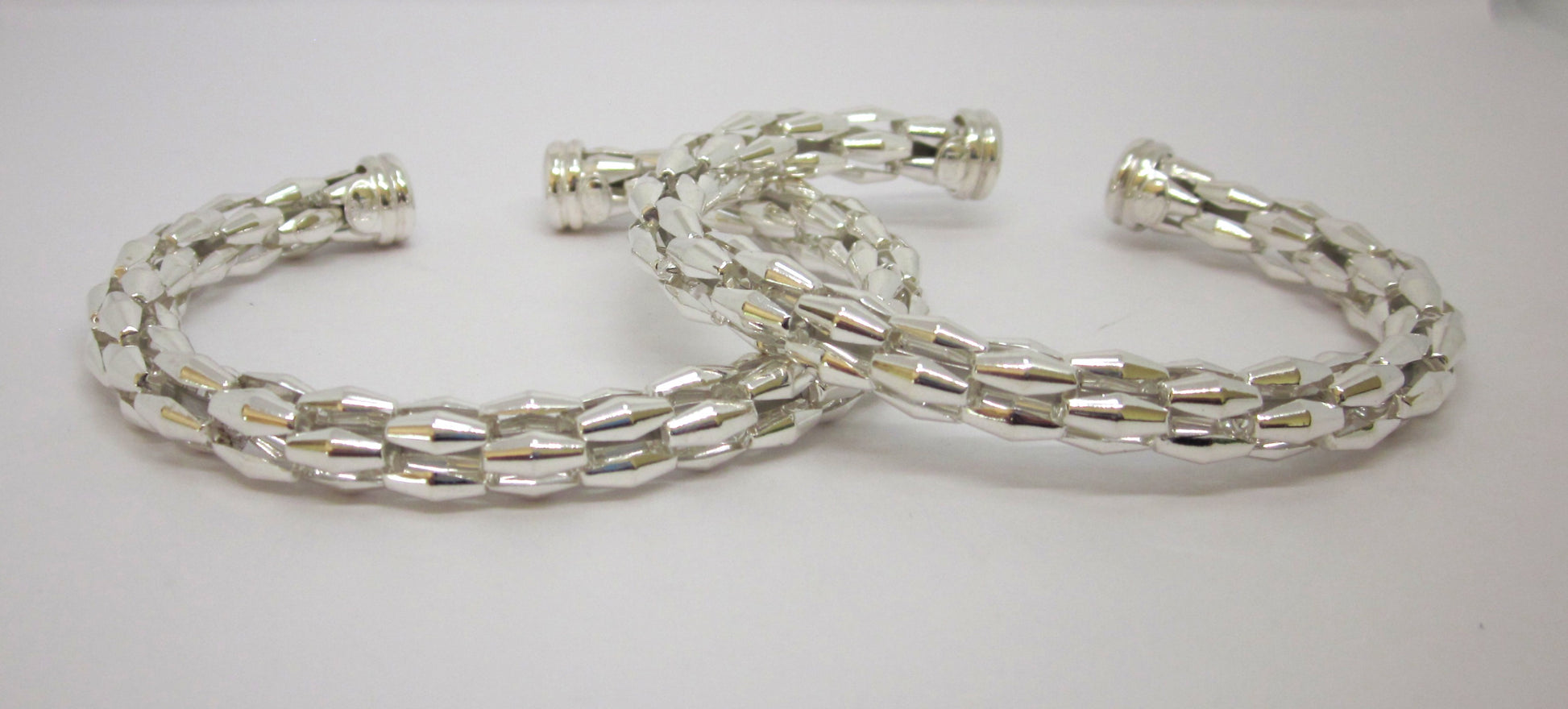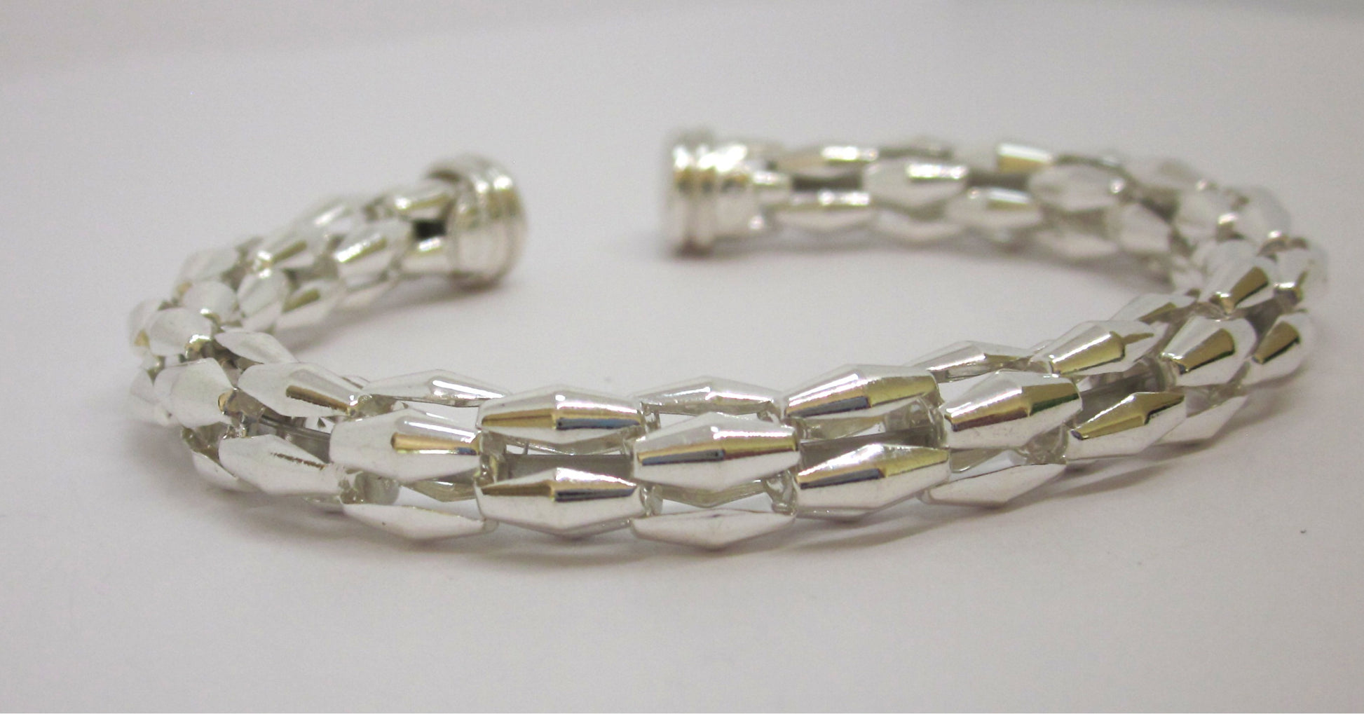 Each silver segment is meticulously linked to create a structured yet flexible form, giving this bangle a distinctive texture and a strong, elegant presence.