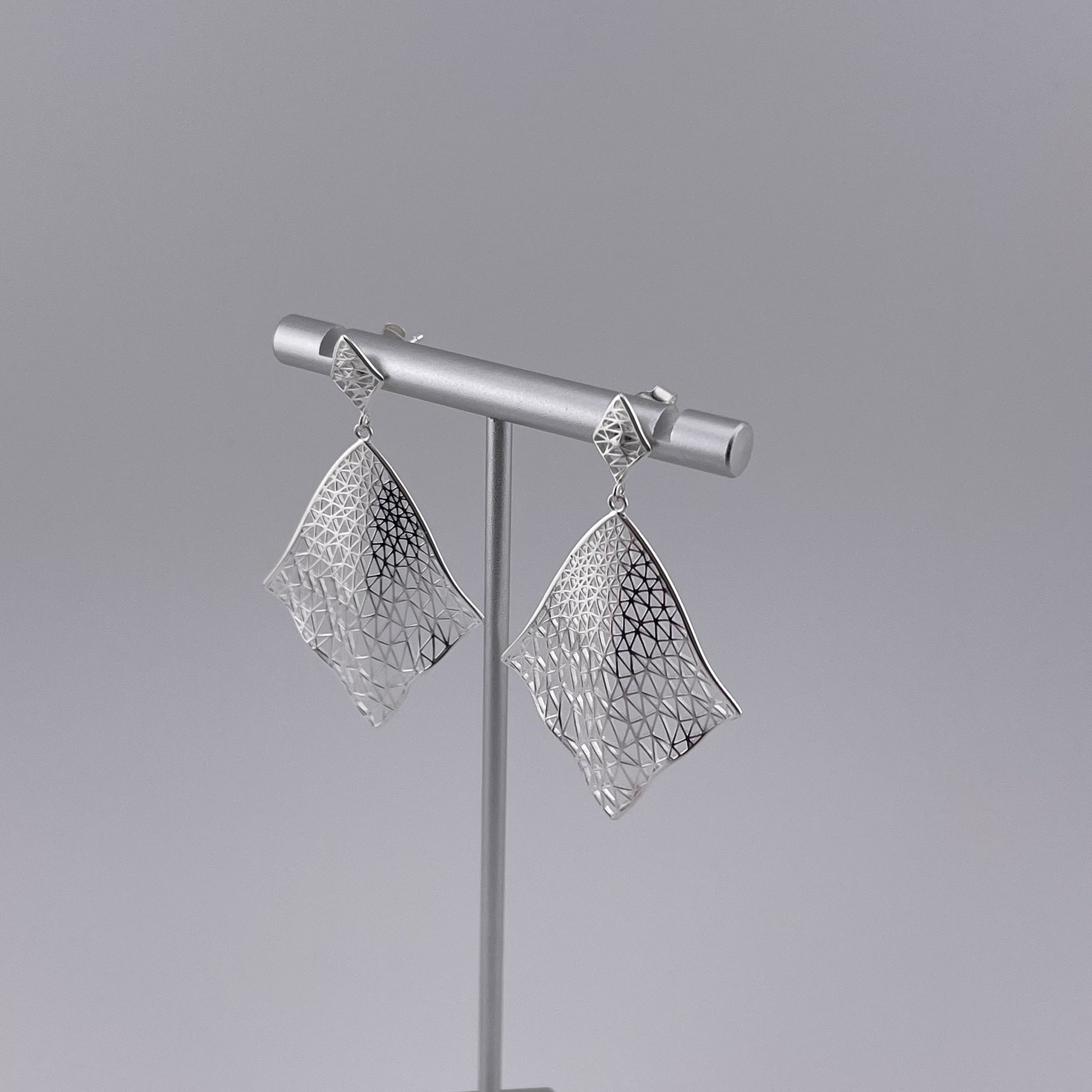 Add modern elegance to your jewelry collection with these sterling silver diamond-shaped drop earrings. Designed with a delicate geometric cut-out pattern, they create a sophisticated play of light and shadow while remaining lightweight and comfortable. The unique shape blends contemporary artistry with timeless silver craftsmanship, making them a standout accessory for any occasion.